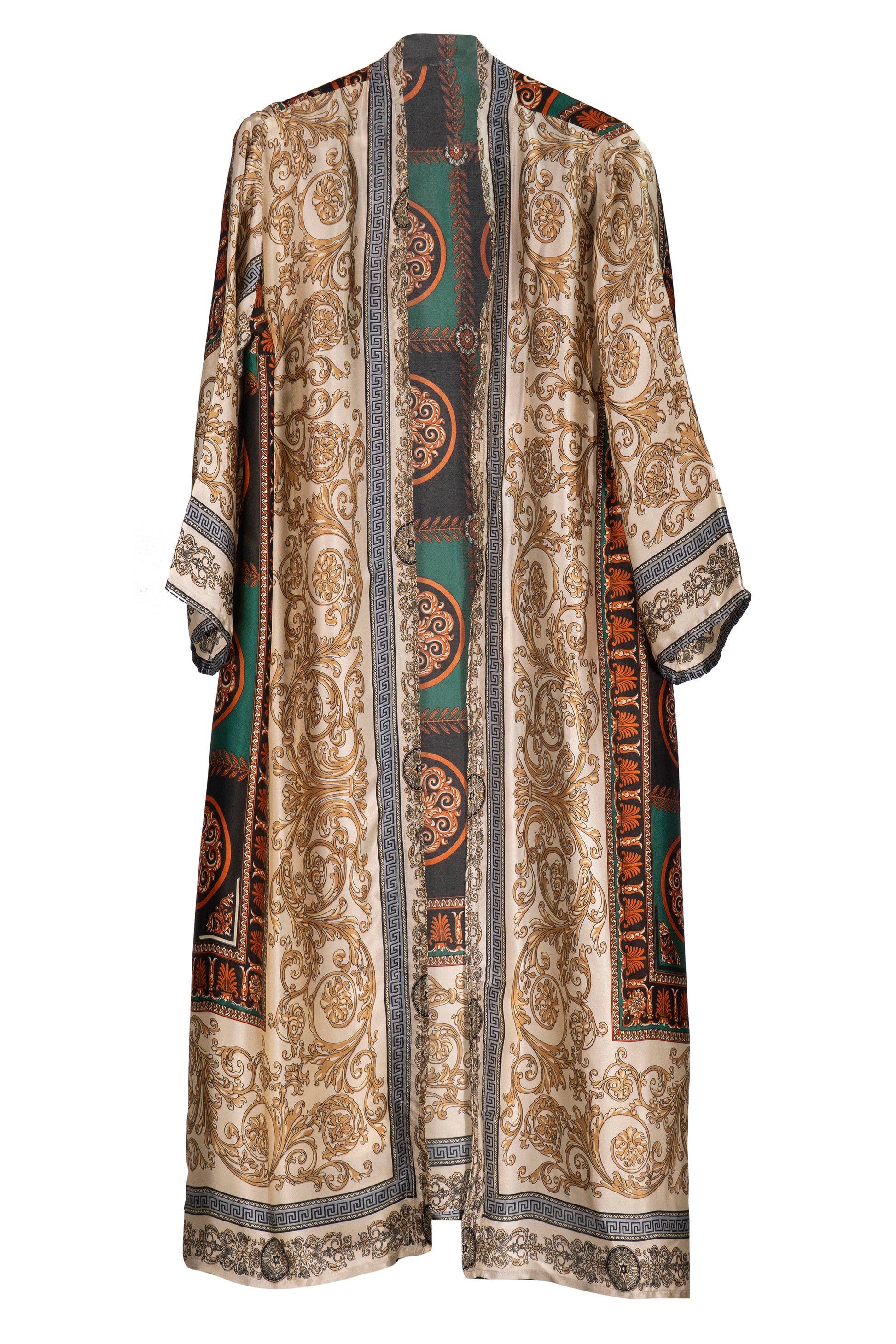 - The Baroque Verde Kaftan is a luxurious ode to timeless opulence. Its deep emerald and bronze palette is framed by ornate ivory scrolls and golden baroque detailing, evoking the grandeur of Italian palazzos. Crafted in soft silk, it flows with refined ease — a statement of elegance and quiet power