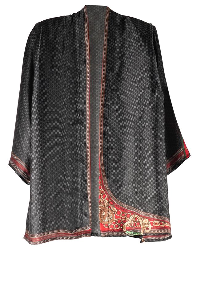 A deep charcoal silk kimono jacket elevated with subtle geometric micro-prints and ornate baroque borders in warm gold and burgundy tones. Lightweight and fluid, it layers beautifully over both casual and evening looks, adding understated luxury and Italian charm.