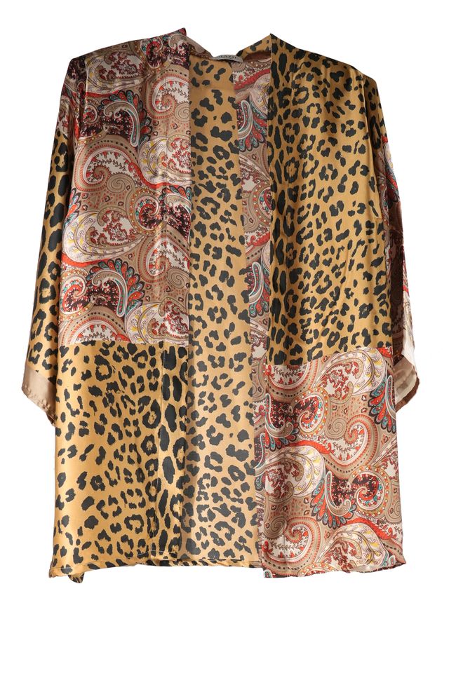 A bold clash of wild leopard and soft paisley in warm caramel and nude tones. This statement silk jacket brings a perfect balance of softness and strength, designed to elevate even the simplest look with effortless Italian flair.